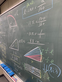 11月22日、土曜日、中1mathでは、 おうぎ形の弧の長さや面積を求めるトレーニングを 沢山しました! 導入、黒板練習、解説、ワークなど、 一式おこないました 中1math、おうぎ形のトレーニングより